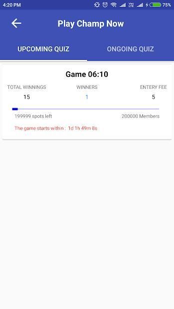 PlayChamp अब भारत का पहला-तरह का लाइव क्विज़ शो है। आप केवल 1 मिनट खर्च करके वास्तविक नकदी जीत सकते हैं। खेल दिन के हर घंटे रहता है।