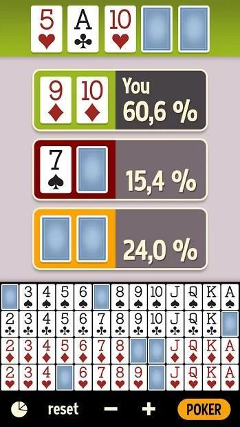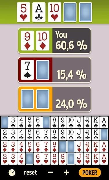 यह अच्छा पोकर ऑड्स कैलक्यूलेटर आपको अपने pokerhands की गणना करने और पोकर हाथ जानने के लिए मदद मिलेगी।