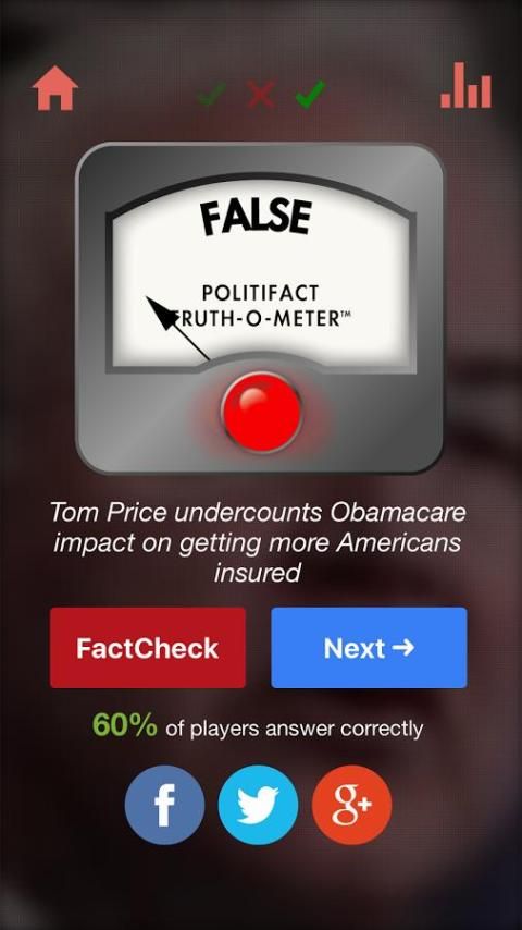 स्वाइप का अनुमान लगाना एक समाचार कहानी यह सच है अनुमान लगाना गलत और कड़ी चोट सही है छोड़ दिया है। खेल पुलित्जर पुरस्कार विजेता संगठन बेहतर सूचना के स्रोतों विचार करने के लिए है, जबकि सार्वजनिक गलतफहमी पर लाभकारी आंकड़े जुटाने खिलाड़ियों को प्रोत्साहित करने की उम्मीद में PolitiFact के साथ साझेदारी में किया जाता है। हमारे प्रतिस्पर्धी प्रकृति में टैप करके, हम राजनीतिक चेतना का विस्तार करने की उम्मीद है।