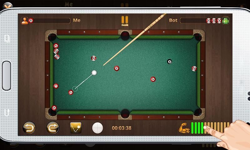Play against the robot with standard 8 ball rules or 9 ball rules. Touch the screen to adjust the direction and drag down the power-up in the RIGHT to strike. Touch and hold at any point to move the cue-ball and tap to confirm for Free-ball.