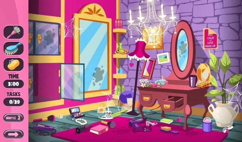 ** 8 different rooms to clean from floor to ceiling: bedroom, living room, kitchen, bathroom, bedroom, office, makeup room and a special surprise room!
