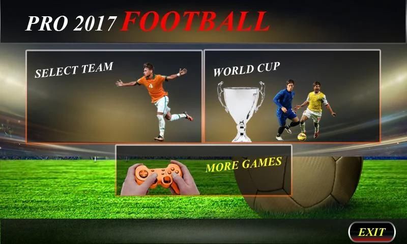 प्रो 2017 फुटबॉल गेम के साथ आप कई प्रकार के गेम का आनंद ले सकते हैं जैसे क्विक गेम प्ले और टूर्नामेंट का चयन करके