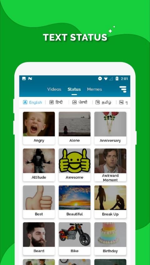 If you like quotes and status more than videos then we have added large collection of text quotes and status as well. We have added quotes and status of 5 different languages like Hindi Quotes and Status, English Quotes and Status, Punjabi Quotes and Status, Gujarati Quotes and Status and Tamil Quotes and Status. You can save quotes as image or copy quotes as text and paste on your status.