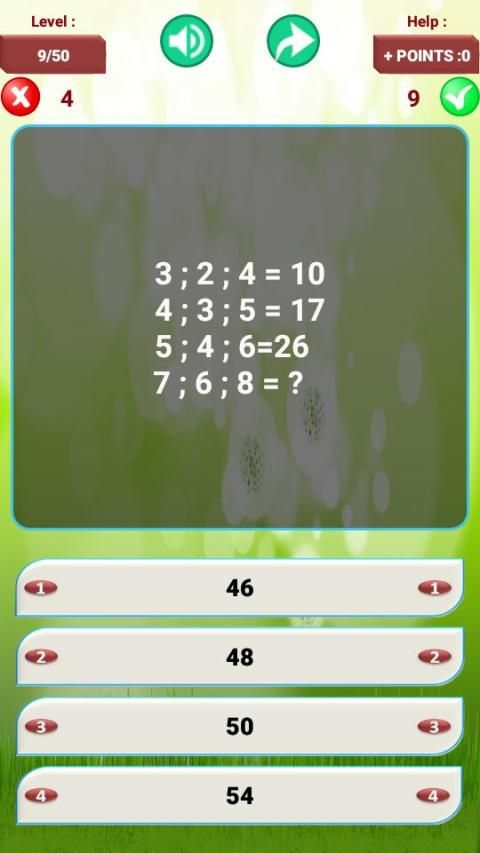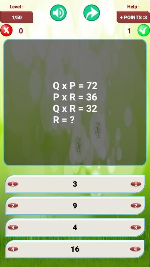 After entering the game of " Puzzles Of Maths ", press the "new quiz" button, the quiz will launch, each puzzle is attached to four answers, it requires the player a little attention and try to find the right answer.