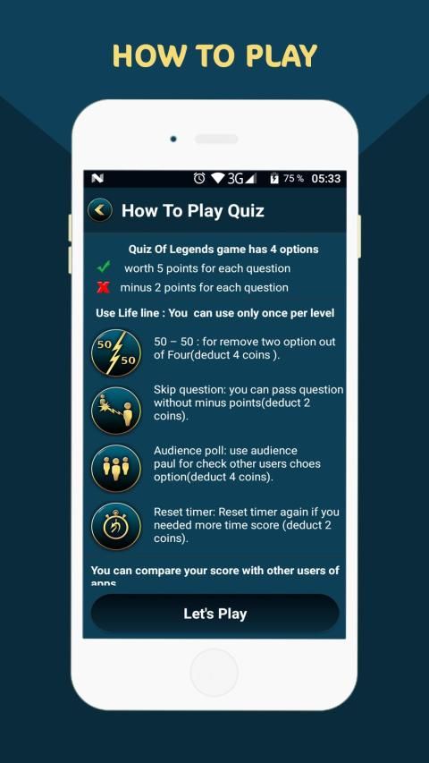 किंवदंतियों ज्ञान के अपने लीग का परीक्षण करें! क्विज़ एक मल्टीपल लेवल क्विज़ है। लोल चैंपियंस, एबिलिटीज़, स्किन्स, लोर, ... के बारे में सवाल हैं।