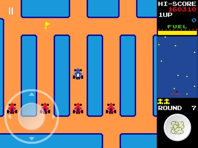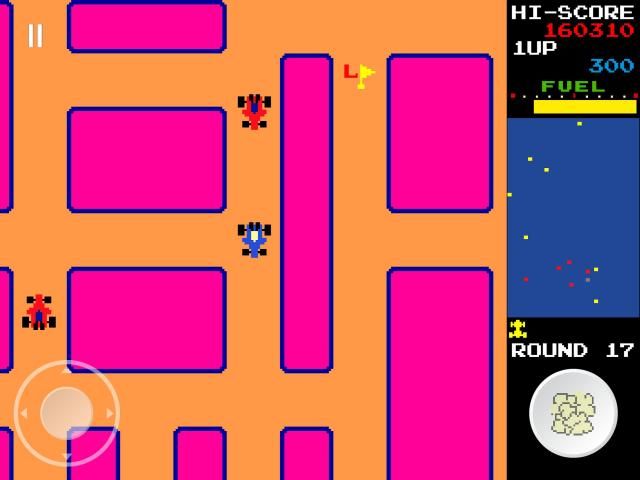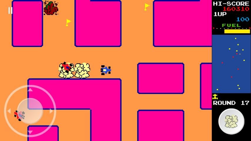 The player drives a blue car around a multi-directional, scrolling maze. The car automatically moves in whichever direction the joystick/d-pad is pressed, but if it runs into a wall, it will turn and continue. The player must collect all of the flags to clear the round and move on to the next round. The flags increase in value as they are collected: the first is 100 points, the second is 200, the third is 300, and so on. There are also special flags (indicated by red S) — if the player collects it, the value earned from flags doubles for the rest of the round. If the player dies, however, the double bonus is lost. The player will also obtain a fuel bonus after get the lucky flag(indicated by red L) and after the round is complete, and it varies depending on how much fuel is remaining according to the fuel gauge.