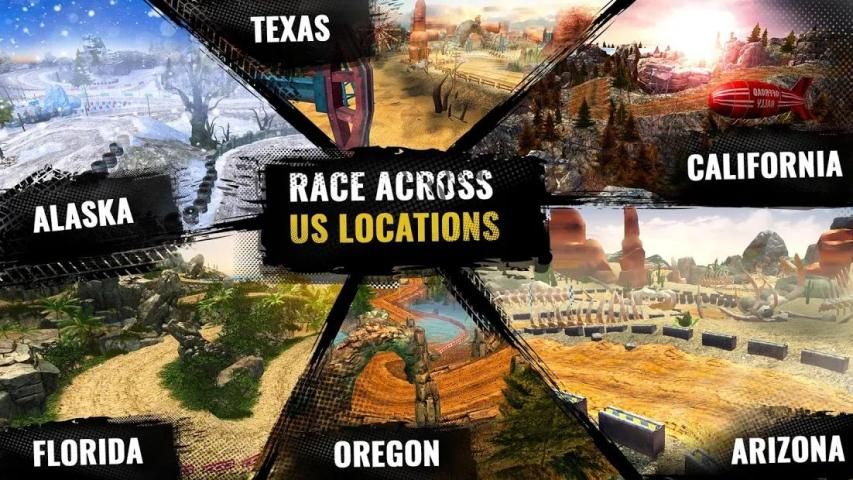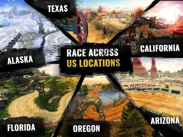 कई प्रतिद्वंद्वियों के साथ दौड़ें, पागल स्टंट और रैली कार खेलों की अन्य अच्छी चीजें करें। आप एक हेलीकॉप्टर के खिलाफ एक ट्रक दौड़ भी कर सकते हैं! शांत पुरस्कार और बोनस अर्जित करने के लिए ऑफ रोड रेसिंग ट्रैक पर अपने पागलतम करें।