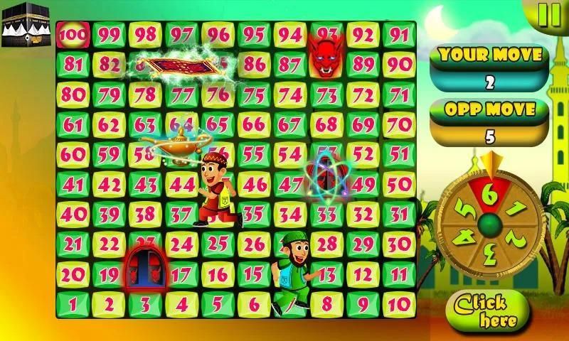 Discover a new way of playing Snake and Ladders game. Play the most addictive childhood game in a new avatar as Ramadan Magic Mat. Experience the exotic delights of ancient Arabia and be amazed by mysterious game play. The objective of the game is to reach at the Macca first. You have to beat the opponent by reaching before him. Start the game by making a wish of your desired number and spin the wish wheel and see if it comes true. Get bonus chance if you get number 6. The magic carpets will fly up and drop you anywhere on the board. And magic lamp will fly you up and drop at 91. The hell door and magician will throw you down back. The magic lamp and hell door will appear at a new place in the same row after each turn of opponent. The game features real and fictional characters that will keep you engaged and addicted for hours in a fantastic ancient theme. Let’s see how long you manage to beat the opponent?