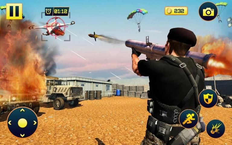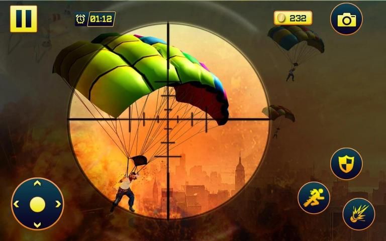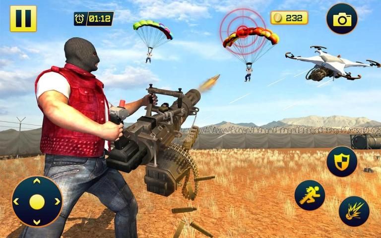 पैराशूट आपको युद्ध में पैराशूट पर हमला करने वाले प्लेन, बाज़ूका गेम के हथियारों या गोला-बारूद में रॉकेट के साथ शूटिंग के खेल में द्वीप पर आने में सक्षम करेगा। हथियारों को इकट्ठा करें और विमानों को शूट करने के लिए तैयार करें एंटी-एयरक्राफ्ट गन हमले में। एयरप्लेन शूटिंग लॉन्चर गेम का आवश्यक बिंदु इस लक्ष्य शूटिंग स्ट्राइक गेम में जेट्स को मारना है।