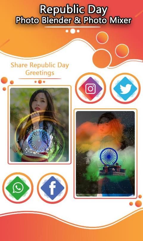 "फोटो मिक्सर" ऐप के साथ गणतंत्र दिवस की शुभकामनाएं देने का अनोखा तरीका। सम्मिश्रण प्रभाव की एक विस्तृत श्रृंखला के साथ पेशेवर फोटो प्रभाव देने के लिए बिल्कुल सही "फोटो ब्लेंडर" ऐप