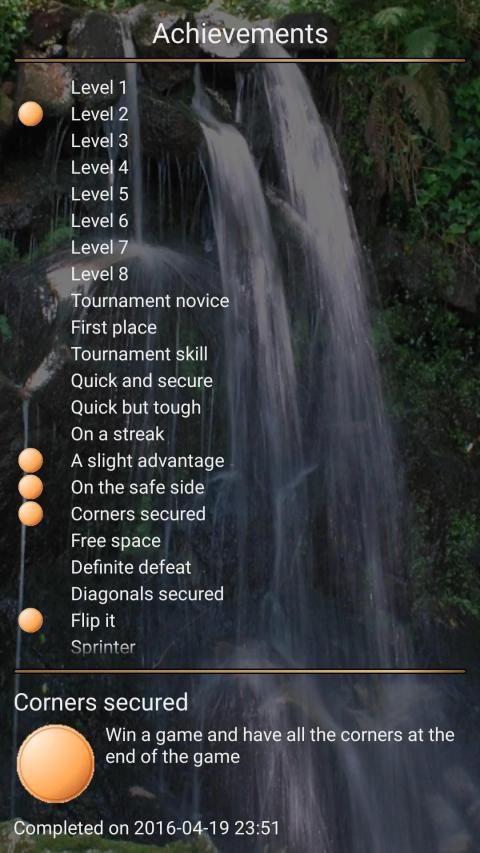Reversi also features a number of achievements that can be earned when playing single games and when playing tournaments. For every achievement that is completed, you earn bronze, silver or gold medals, depending on the difficulty level that you have chosen. You can also enjoy Reversi together with your friends on your device.