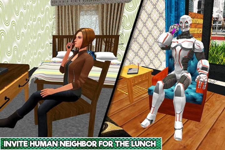 मानव क्षेत्र में वर्चुअल रोबोट की भूमिका निभाएं और रोबोट फैमिली फ़न सिम्युलेटर में मानव जीवन के तरीके को अपनाएं। इस वर्चुअल रोबोटिक गेम में खेलने के लिए शानदार काम, अपने स्मार्ट फोन का उपयोग करके दोपहर के भोजन के लिए मानव पड़ोसियों को आमंत्रित करें। मेहमानों के लिए स्वादिष्ट भोजन कुक। अपनी रोबोटिक शक्ति के साथ वैन उठाकर सड़क क्लीनर की सहायता करें ताकि वह आसानी से क्षेत्र को साफ कर सके।