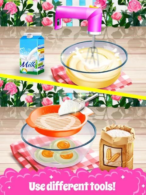 - Tons of food materials and decorations to try: fruits, candies, sprinkles, milk, flour, salt, sugar, butter, eggs, chocolate, ice cream, cream, water, cotton candy, cookies, caramel and so much more.
