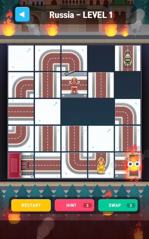 Move the tiles to make way for the fire truck to pick up the fireman and run to fire!