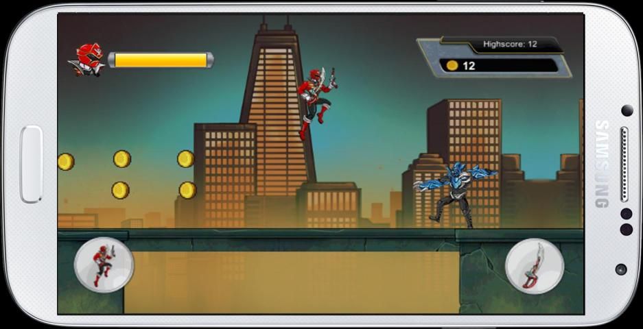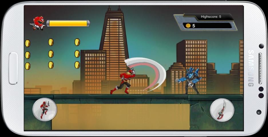Samurai red rangers run and attack enemies in the street. Enemies are destroying the cities. Let fight together with ranger to save the world.