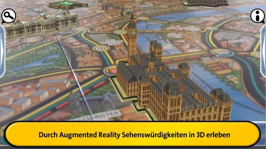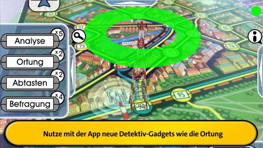 Sie wählen zum Beispiel die Handyortung und richten die Kamera des Smartphones oder Tablets auf die vier auf dem Spielplan verteilten Funkmasten. Grüne, gelbe oder rote Funkwellen zeigen, ob Mister X sich in der Nähe aufhält oder nicht. Eine weitere Möglichkeit ist die Zeugenbefragung an bedeutenden Bauwerken der Metropole. Wieder kommt die Kamera zum Einsatz und lässt Tower Bridge, Houses of Parliament oder St. Paul‘s Cathedral in 3D erscheinen. Zeugen verraten, ob Mister X sich dort befindet oder vor kurzem hier war.