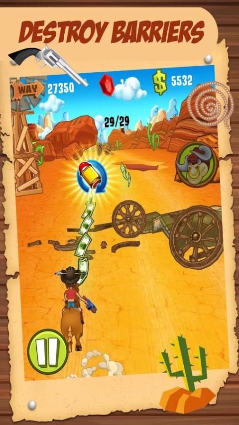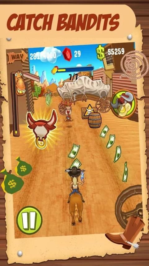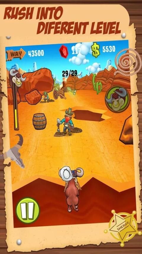 एक चरवाहे के रूप में आप भी एक बैल है कि आप कुछ समय और किसी भी बाधाओं को दूर करने की क्षमता के लिए अकाटता दे देंगे पर सवारी करने में सक्षम हो जाएगा। जिस तरह से साथ पैसे इकट्ठा करने के लिए, आप बोनस, हथियार, टोपी के लिए सुधार की खरीद और नए पात्रों की खोज करने का अवसर होगा। असाधारण Stetsons और अन्य पुरस्कार छाती है, जो प्रत्येक खिलाड़ी के लिए उपलब्ध है से नि: शुल्क प्राप्त किया जा सकता।
