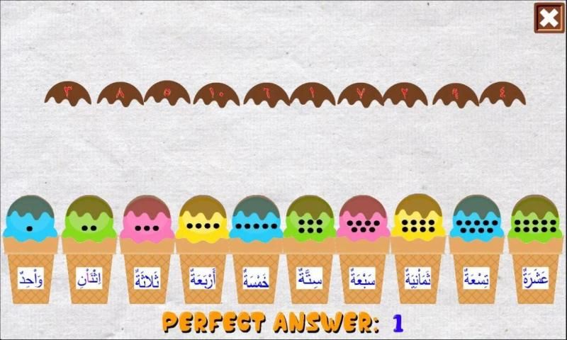 के अरबी में 1 से 10 की संख्या के बारे में जानें। अरबी अंक, वस्तुओं के एक ही नंबर गिनती करने के लिए, और लिखित रूप में अरबी संख्या: प्रत्येक पहेली कार्ड तीन टुकड़े (कोन, आइसक्रीम, टॉपिंग) है। बस 10 आइसक्रीम होना करने के लिए एक साथ टुकड़े मिलान करके, बच्चों अंक और अरबी में संख्या की वर्तनी की पहचान करने के लिए सीखना होगा। 6. सिखाओ गिनती कौशल - उम्र 3।