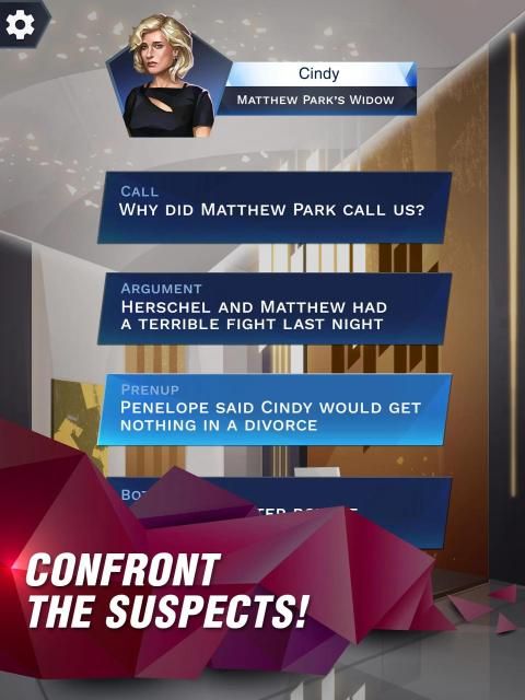 Find clues by talking to suspects and investigating whether their alibis hold up. Did anyone actually witness the murder? Every character has secrets - can you determine which are relevant to solving the case? Confront suspects with evidence to find their motives and make them come clean!
