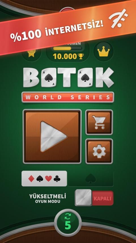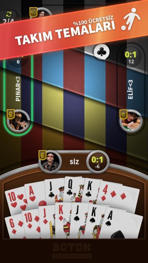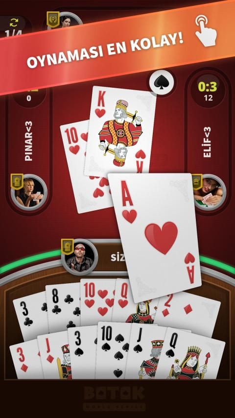 Batak, kart saymaya ve şansa dayalı oldukça seri ve zevkli bir kart oyunudur. Mevcut sürümümüzde ♠ Koz Maça ve ♠♥♦♣ İhaleli Batak oyun seçeneklerimiz ile kullanıcılarımız eğlenceli yapay zekamızın keyfini çıkartabilirler. Yeni rütbelere ulaşabilirler, tamamen ücretsiz olan takım temalarımızla oyun zevklerini daha da renklendirebilirler. Görsellerimiz oyuncularımızın geçirdiklerini zamandan daha çok keyif almalarını sağlamak için daha gerçekçi bir tasarıma sahiptir. Oyunu hemen indirip bu kesintisiz zevkin bir parçası olabilirsiniz.