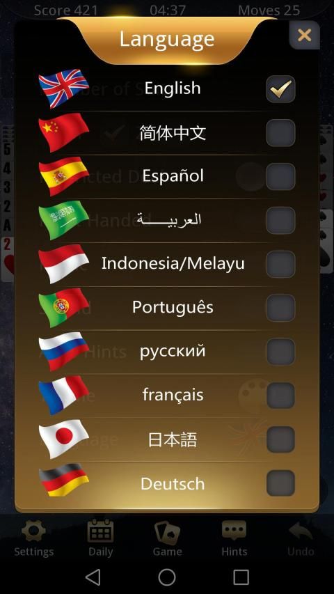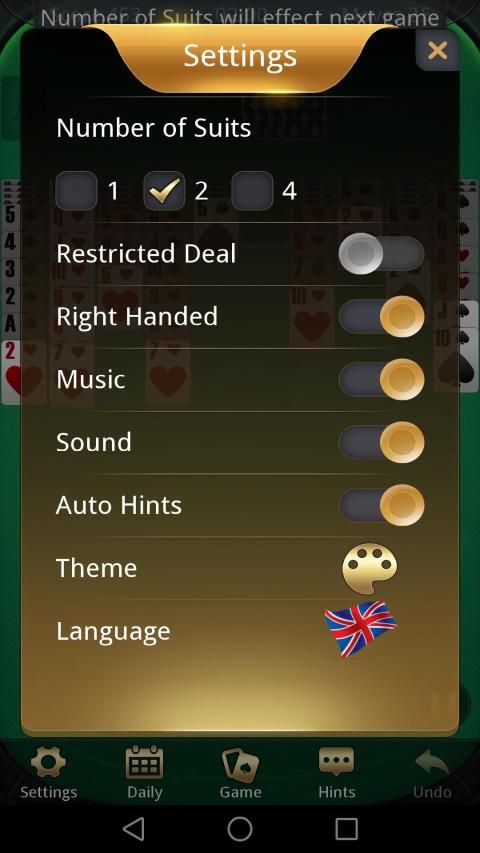 Three challenges are waiting for playing every day. Solitaire rewards winners with gold/silver/bronze cups and extra crown(s). Variant daily task from easy to hard: 1 suit, 1 suit without hints, 2 suits.