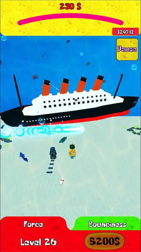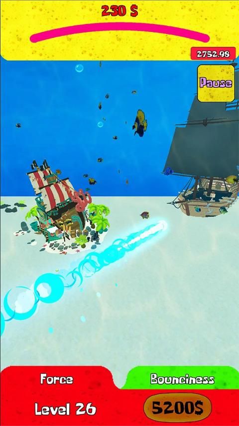 Help the Sponge to improve his best strike distance and the ball capabilities. For example: upgrade the ball bounce and hit the ball more far and see all the beautiful corners in this Beautiful Bottom city!