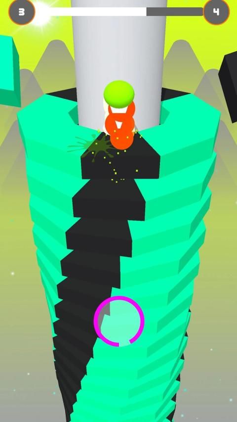 अपनी गेंद को अपने वंश के माध्यम से काले एक को पकड़े बिना रंगीन प्लेटफार्मों को तोड़ना चाहिए। यदि आप एक काला मारा, यह सब खत्म हो गया है! आपकी गेंद टुकड़ों में दुर्घटनाग्रस्त हो जाती है और आपको फिर से शुरू करना पड़ता है। लीड का उपयोग करें ताकि आप बूस्ट-अप प्राप्त कर सकें और उस समय आप प्लेटफार्मों के माध्यम से ब्लास्ट कर सकते हैं। बंद करें और जब आप काले प्लेटफार्मों पर हों तो रोल करने और कूदने के अपने अगले मौके की प्रतीक्षा करें।