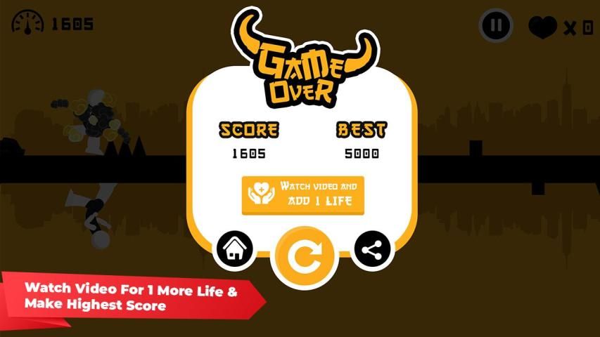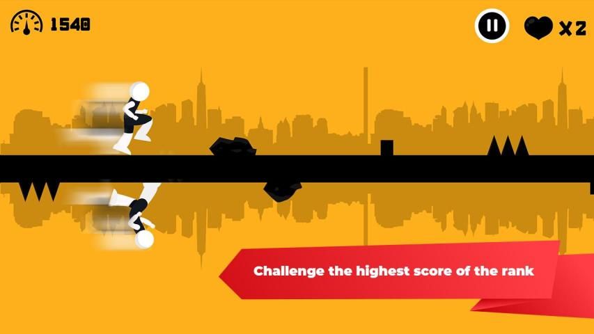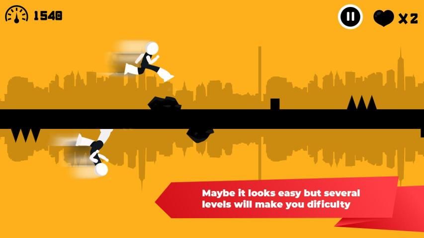 Start Stickman Infinity Runner game .Tap on Ply Button.One Tap to Jump on top and Bottom both side.When there is stone on way, then jump stickman with one click and Pass this stone . We provide 3 lifes for you because you can play with your best score.share your best score with your friends and impress him/her.