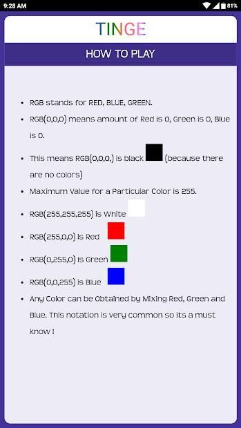 टिंगे यादृच्छिक रूप से भविष्यवाणी करने के लिए एक रंग उत्पन्न करता है और रंग को लाखों रंगों से यादृच्छिक रूप से चुना जाता है। खिलाड़ी को 9 रंग दिखाए जाते हैं, जिनमें से दर्शाए गए रंग का चयन किया जाना चाहिए। पहले चुनौतीपूर्ण, खेलने के लिए रोमांचकारी और आप इसके साथ अनुभव करने के बाद तेजी से और सटीक होने के लिए उपयोग किया जाएगा।