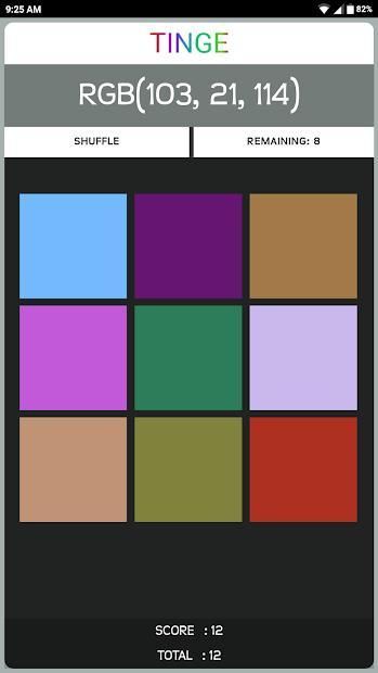 Tinge randomly generates a color to predict and the color is selected randomly from over a million colors. The player is shown 9 colors from which the represented color has to be selected. Challenging at first, thrilling to play and you will get used to being fast and accurate after getting experienced with it.