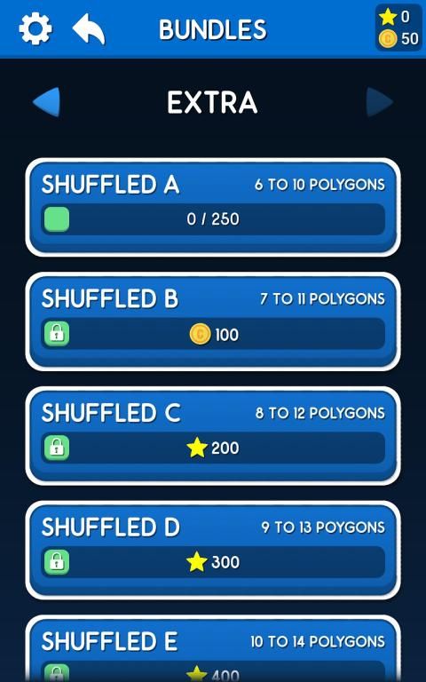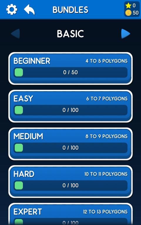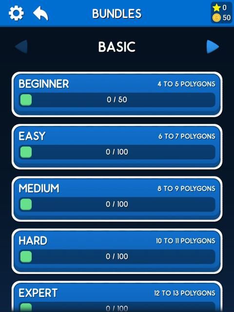 All puzzles contain a range of 5 to 14 polygons so there is a puzzle for everyone.