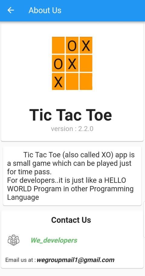 टिक टैक टो (जिसे एक्सओ भी कहा जाता है) ऐप एक छोटा गेम है जिसे सिर्फ टाइम पास के लिए खेला जा सकता है।