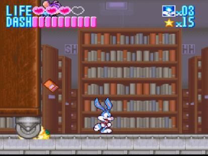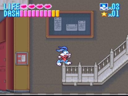 This game features Buster Bunny in a side-scrolling adventure. It has three difficulty level settings: easy, normal, and hard (in game they are known as "Children", "Normal" and "Challenge" modes respectively) (except the Japanese version which only has easy and normal). Levels are significantly smaller in easy mode, and Buster only has one health container in hard mode, although extra containers can be collected by exploring the levels. The number of containers are reset after each level. This is done to add more of a challenge in this mode.