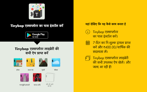 Tinybop एक्सप्लोरर लाइब्रेरी ऐप्स खेलने के लिए Tinybop एक्सप्लोरर का पास पाएँ। पहले इसे इंस्टॉल करें। फिर, अपने 7-दिन के निःशुल्क ट्रायल की सदस्यता लें। इंंस्टॉल करें और Tinybop एक्सप्लोरर लाइब्रेरी के 6 ऐप्स चलाएँ!