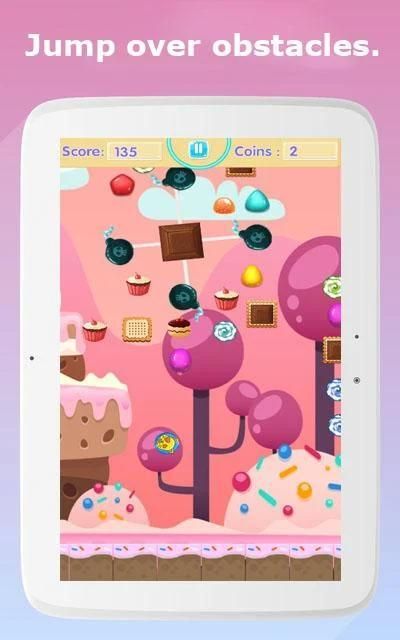 - Jump over obstacles (or just avoid them): Bombs, Spikes and Candy Sticks.