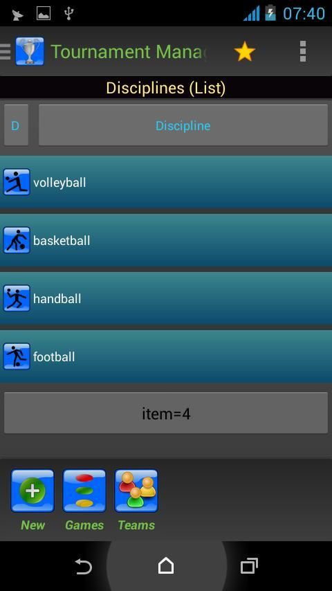 - खेल की एक सूची है और चयनित खेल को सौंपा टीमों की सूची।