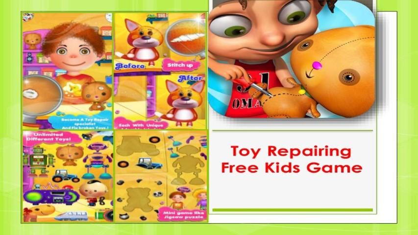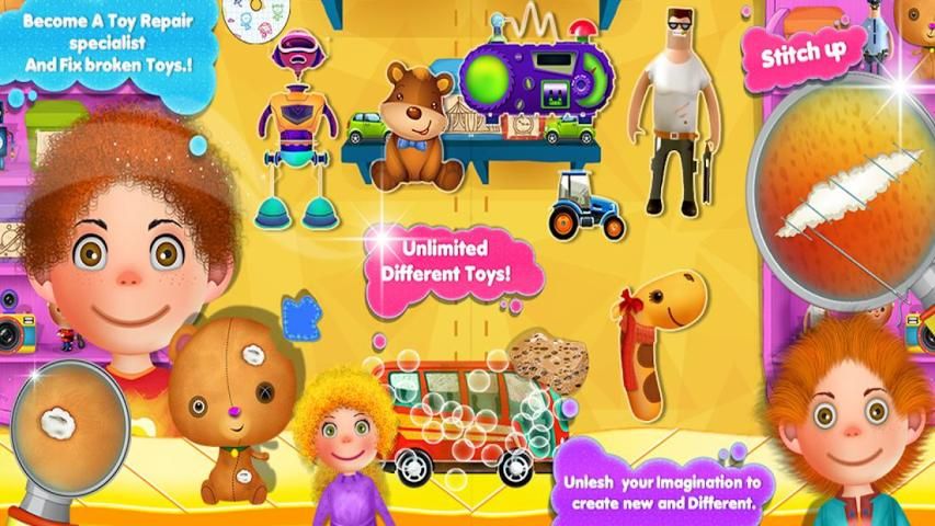 Users will get to repair 30 different toys including dolls, fireman, policeman, soldier, superhero, alien, robot, different vehicles and cars, teddy bears and plush animals like mouse, cat, dog, tiger, cow, elephant, giraffe and monkey and more,
