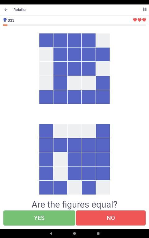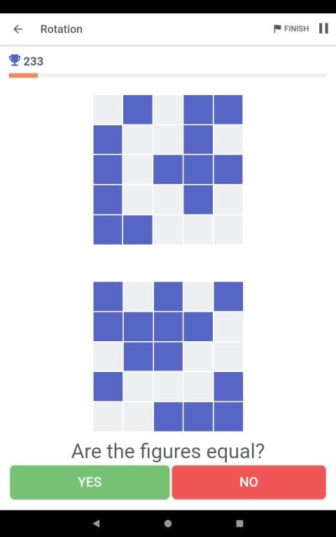 - 'Rotation' game trains your spatial thinking and focus speed. In this game you should compare two patterns and decide if they are equals to each other.