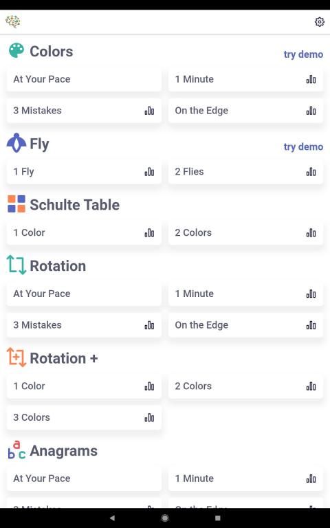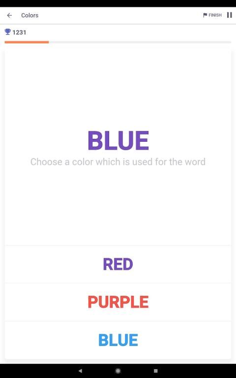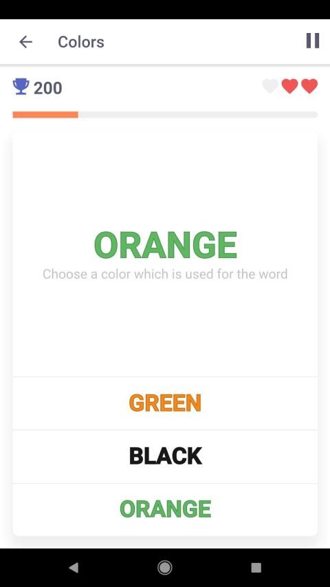 - 'Colors' - is based on Stroop effect (delay in reaction time when given conflicting information). This game improves focus speed and attentiveness.