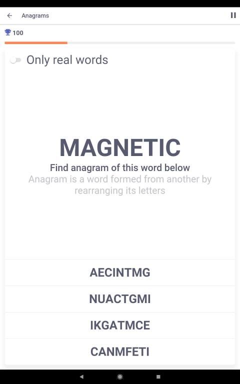 - 'Anagrams' - improves focus speed and attentiveness. In this game you should find anagram for the specified word (anagram is a word formed from another by rearranging its letters)