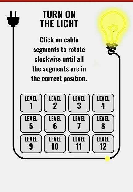यह गेम एक पहेली गेम है, इस गेम में आप लाइट को चालू करने के लिए तारों (रेखाओं) के सेगमेंट में शामिल हों।