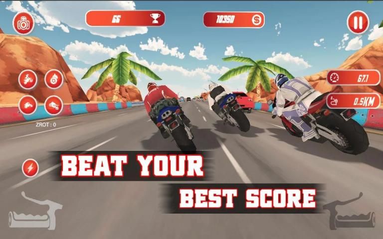 TIPS- तेजी से आप बाइक की सवारी करते हैं, जितना अधिक स्कोर मिलता है- जब आप 100 किमी से अधिक की सवारी करते हैं, तो बोनस स्कोर और नकदी प्राप्त करने के लिए भारी ट्रैफिक कारों, ट्रक और अन्य वाहन से आगे निकल जाते हैं- इस सर्वश्रेष्ठ मोटरसाइकिल गेम में विपरीत दिशा में ड्राइविंग दो- तरीका अतिरिक्त स्कोर बाउंस और नकद देता है- अतिरिक्त स्कोर और नकद प्राप्त करने के लिए मोटर साइकिल की सवारी में व्हीलचेयर करें