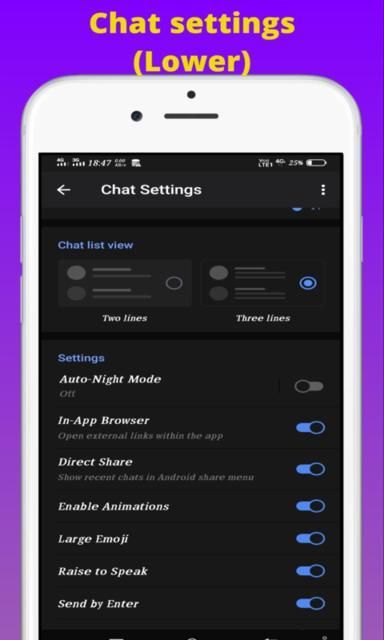 3.if you don't like the default theme please go to settings tab and go to chat settings and disable in - app browser button.