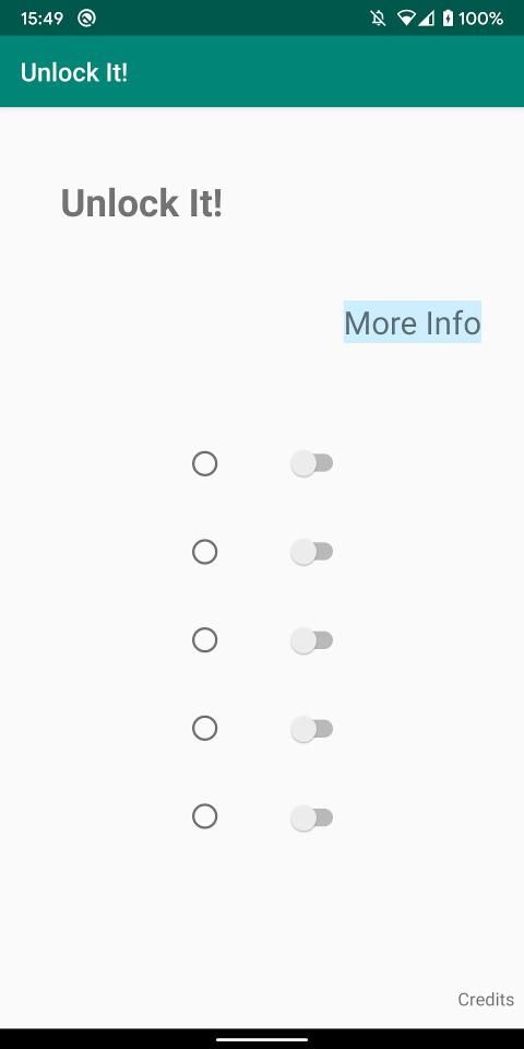 Unlock It! is a game. The game is to discover the right code by the switches selection. If you do not find out the code, each selected switch goes to off after 3 seconds. Please note, the right code has to be on the right sequence, too. You do not have so much time to figure it out. Good luck! Have fun, too. Unlock It!