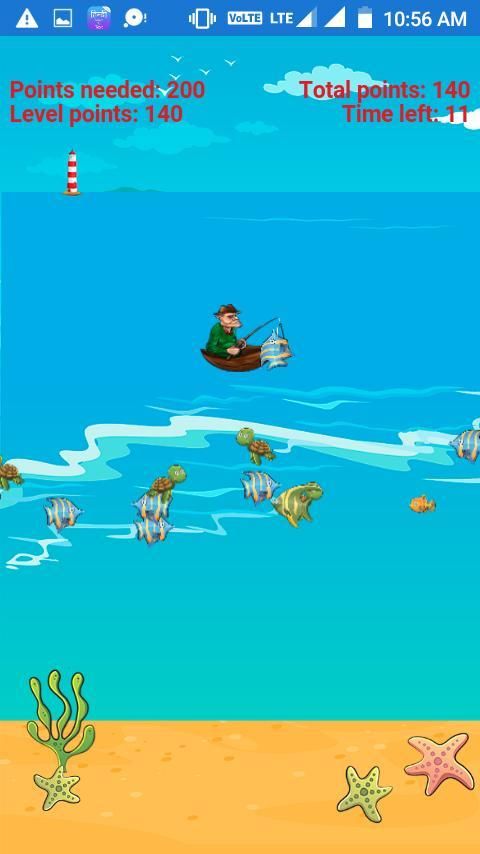 Fishing game is an entertainment game to increase concentration power and enjoy fishing in sea. When you achieved level scores one level will be completed and moved to next level again when required score achieved unlocked to next level.