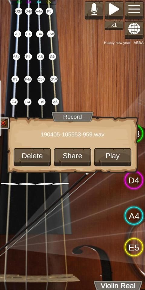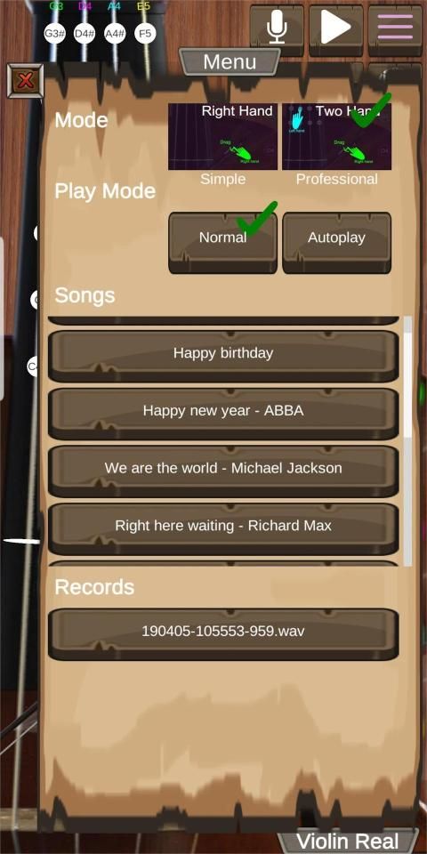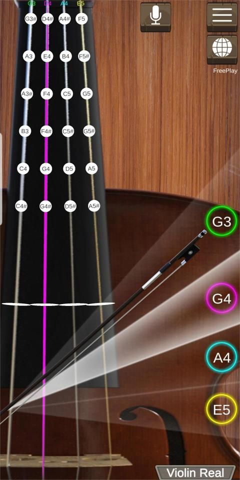 वायलिन रियल आर्को (हैंड ड्रैग वायलिन धनुष का उपयोग करके) और पिज़िकैटो (हैंड टच का उपयोग करके) फ़ीचर के साथ सिमुलेशन ऐप है। फ्रीक्वेंसी रेंज: G3 -> A5 #।