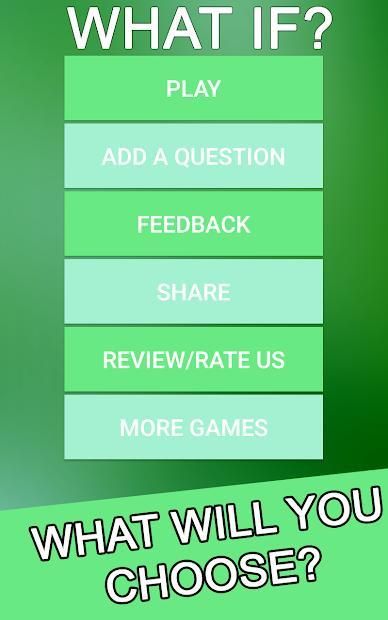 What If For Teens! is a fun and addicting game for any occasion and for all ages. It contains hundreds (with more questions added regularly) to ensure plenty of fun!