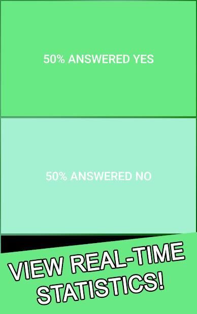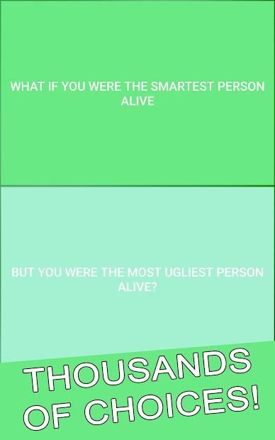 आपको दो परिणामों के साथ एक परिदृश्य दिया जाता है। जिस व्यक्ति को आप जाना चाहते हैं उसे चुनें और प्रत्येक प्रश्न के उत्तर के लिए अन्य उपयोगकर्ताओं से वास्तविक समय के आंकड़े देखें!