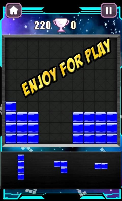 Wood Block Puzzle is a block organization puzzle game similar to where the player must move blocks into rows to remove those rows, keep the board clear, and gain points. In this game, it is also possible to use columns, and the size of the board is also very different. The player can rotate blocks, as in , but this is not as useful as it sounds because a few of the game's rules are slightly different! The game's only issue is that it will often determine some valid moves are impossible, or that the player is out of moves when they are not