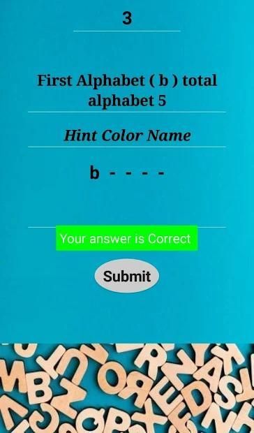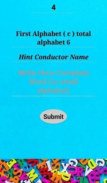 यह एक शब्द पूरा करने वाला गेम ऐप है। आपको पहला वर्णमाला और शब्द वर्णमाला की कुल संख्या भी शब्द, शहर, देश, नाम इत्यादि प्राप्त होगी ..... यदि आपका प्रकार का शब्द डेटा बेस के साथ मेल खाता है तो आप अगला शब्द टाइप करेंगे।